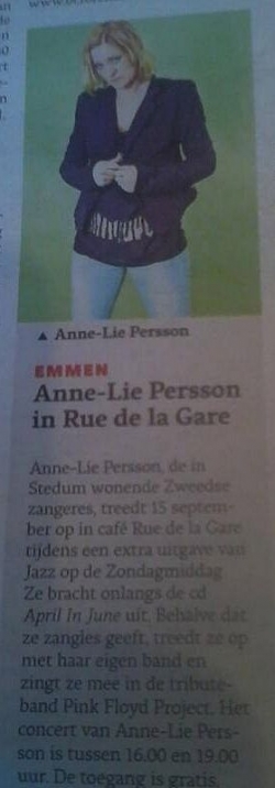 Ankommen zundag is Bert te gast bij het concert van Anne-Lie Persson in Grandcafé Rue le de Gare in Emmen. Van Anne-Lie 's heur plaat 'April in June' zingt zie met 'n beiden het duet 'Five minutes'.