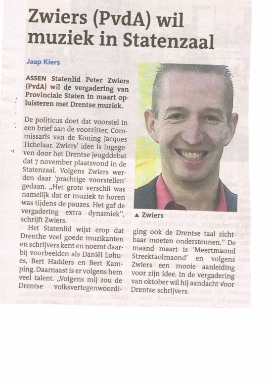 Raodslid Peter Zwiers (PvdA) muuk kenbaar in een brief an CdK Tichelaar dat e geern Drèentse streektaolcultuur in de Staoten hebben wil.